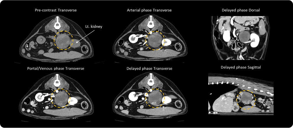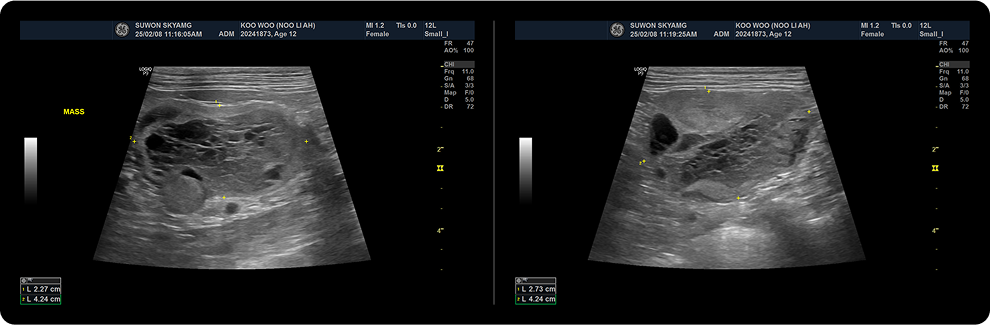 간 실질의 변성과 비대 정도를 평가하고, 쿠싱 질환이 있는 환자에서 호발하는 담낭 병변, 부신의 크기와 형태, 부신 비대, 형태적인 변화, 종양성 변화를 확인합니다.