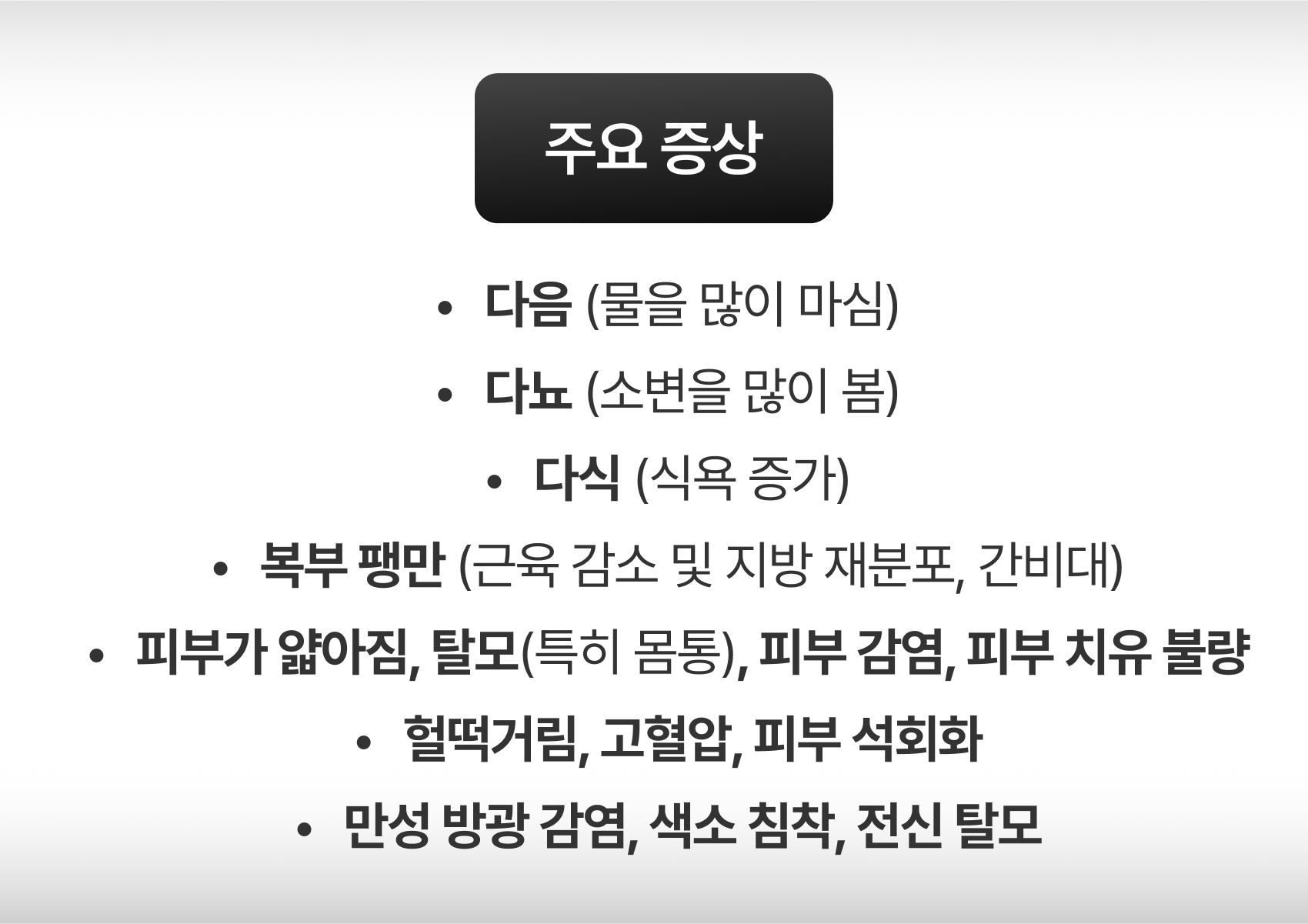 에디슨 신드롬의 증상은 대표적으로 기력저하, 식욕부진, 체중감소 등의 전신적인 활력 감소가 나타날 수 있으며,